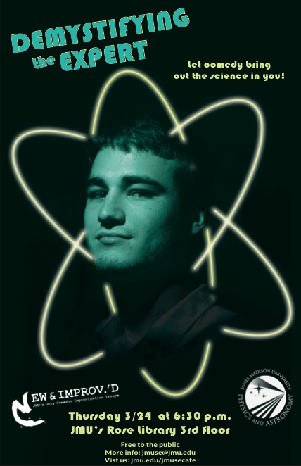My program frequently incorporates projects that will help other JMU programs. One of these was to creating promotional posters for the Demystifying the Expert event. The event is cohosted by JMU's Improv group and the Physics and Astronomy department to encourage fun discussions about difficult scientific topics.