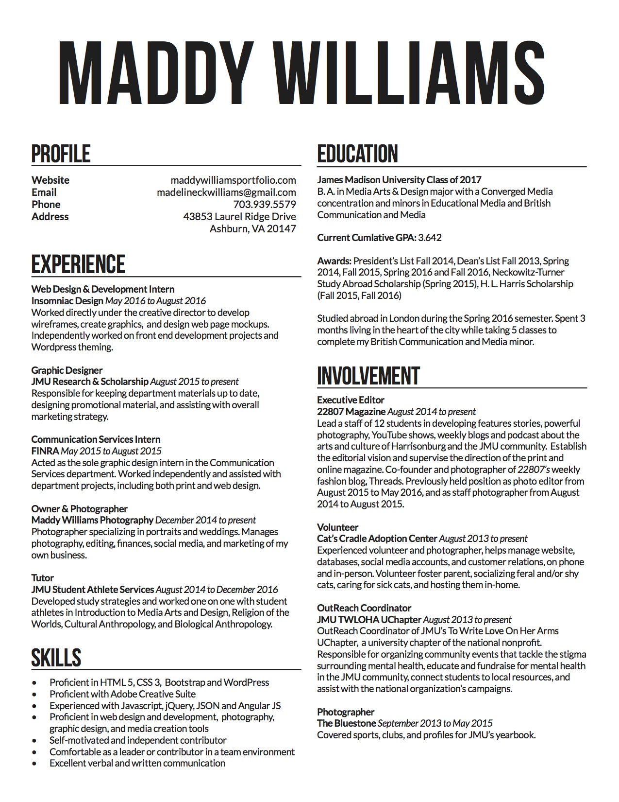 Just looking for cliff notes? You can browse an outline of my work experience, involvement, skills and academic career in the resume below. Browse it online or download a copy to look at later.